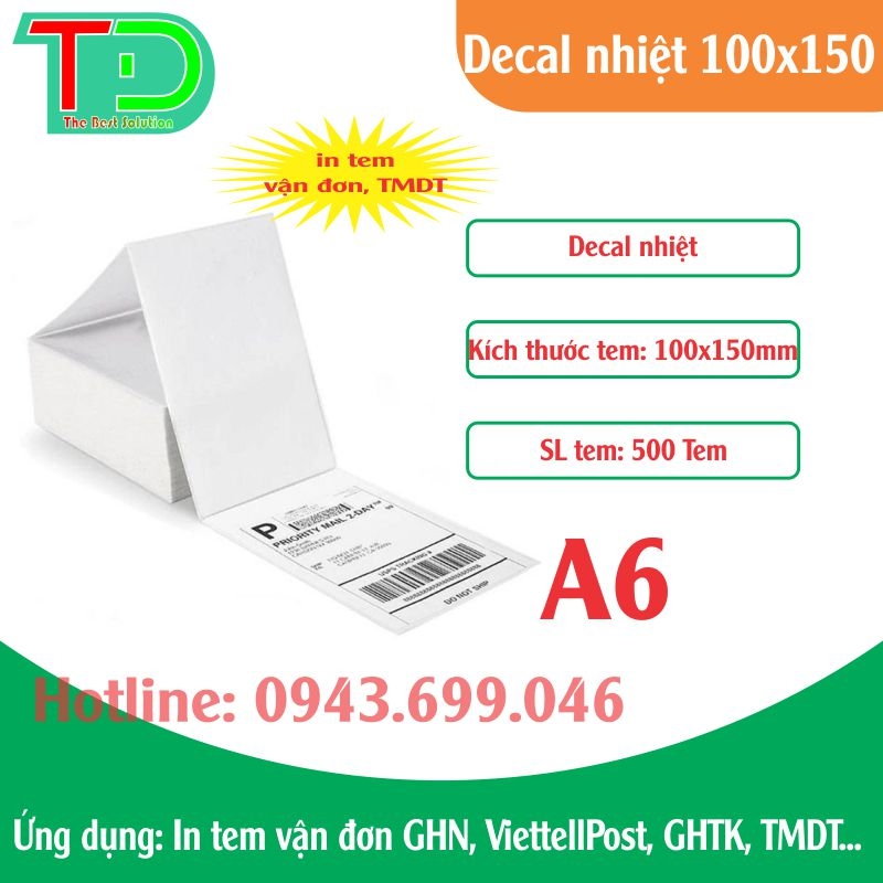 Tem decal cảm nhiệt 100x150mm dạng tệp gồm 500 tờ/1 tập, được thiết kế để sử dụng với máy in mã vạch thông thường (Zebra, Xprinter, Gprinter…) hỗ trợ in tem ở chế độ tệp. Sản phẩm chuyên dùng để in vận đơn TMĐT, đơn giao hàng, tem kiện hàng khổ lớn với tốc độ nhanh, in rõ nét, không cần dùng mực.