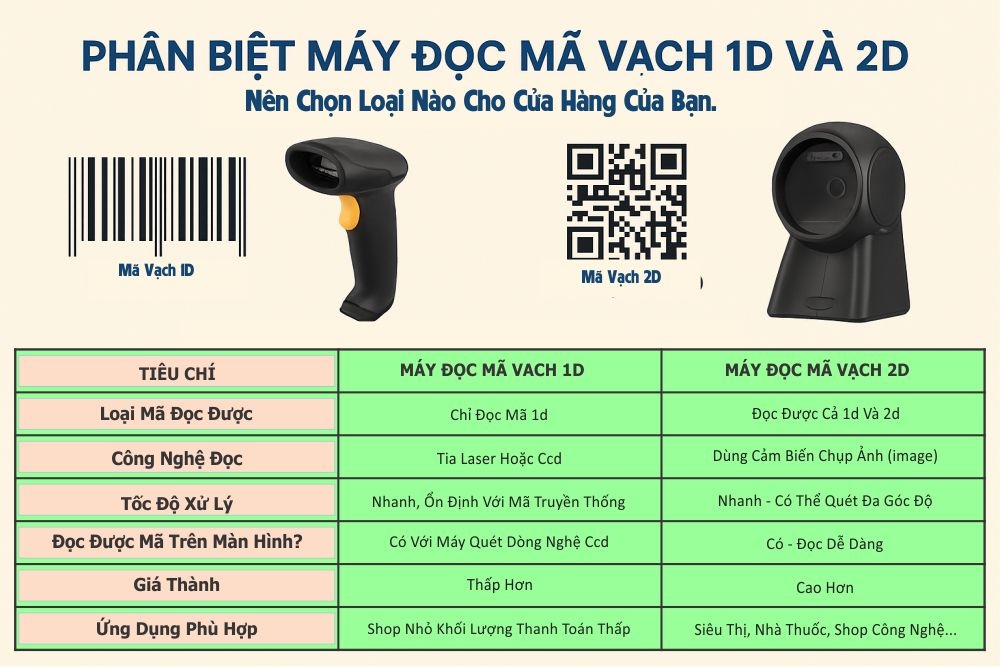 Máy đọc mã vạch là thiết bị quen thuộc tại siêu thị, shop thời trang, nhà thuốc, kho hàng… Tuy nhiên, không phải ai cũng biết sự khác nhau giữa máy quét mã vạch 1D và 2D. Nếu bạn đang phân vân nên chọn loại nào, hãy theo dõi bài viết sau để hiểu rõ cấu tạo, chức năng và ứng dụng của từng dòng.